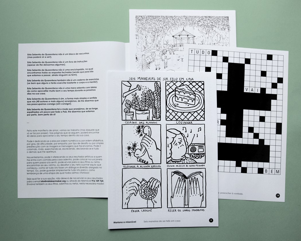 40 autores de várias áreas e backgrounds artísticos: ilustradores, artistas plásticos, calígrafos, escritores, artistas urbanos, arquitetos aceitaram o desafio e criaram a SEBENTA DA QUARENTENA | 40 ideias para aproveitar o tempo.