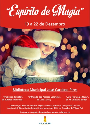 “Espírito de Magia” é o nome da iniciativa que, de 19 a 22 de dezembro, vai levar a equipa da Biblioteca até às crianças das Creches, Jardins-de-Infância e Férias Desportiva e aos utentes das IPSSs do Concelho, dinamizando obras alusivas à época natalícia. “Tradições de Natal”, de autores anónimos, “O Mundo das Pessoas Coloridas”, de Caio Ducca, e “Uma Prenda de Natal”, de M. Christina Butler, foram as obras escolhidas para dinamização nesta quadra festiva.