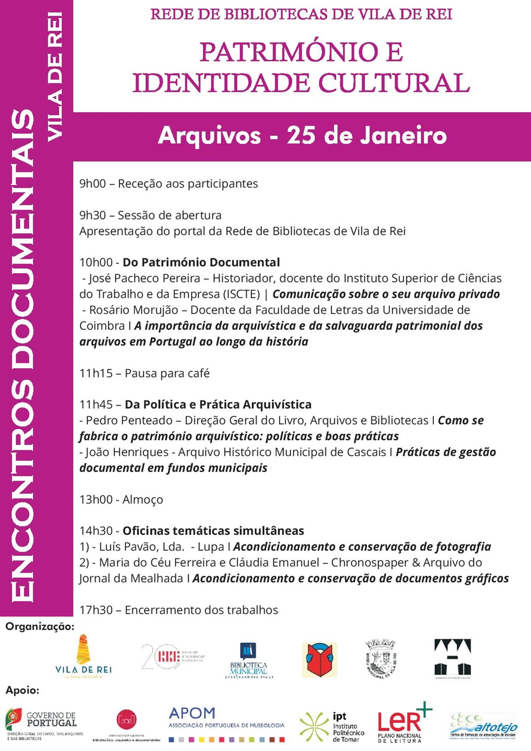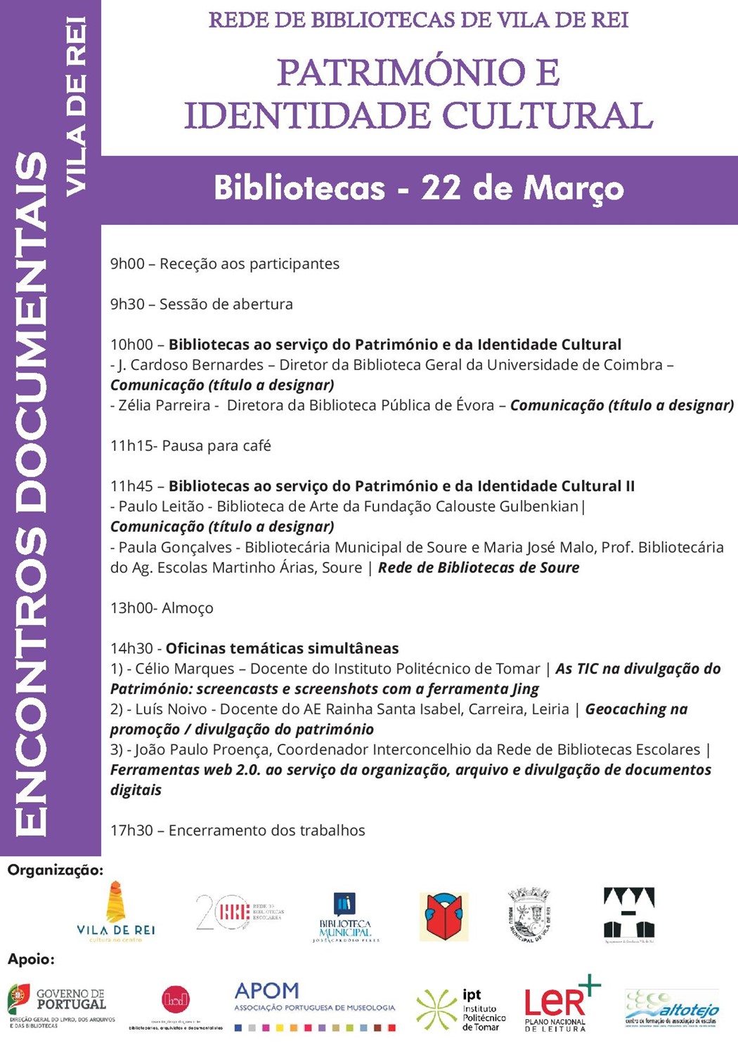 Organizada pela Rede Concelhia de Bibliotecas de Vila de Rei e com “Património e Identidade Cultural” como pano de fundo, a iniciativa vai voltar a juntar um painel de oradores com nome firmado nestas áreas, debatendo assuntos importantes quer para a profissão em si quer para os serviços e cidadãos.