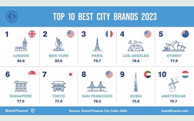 Apresentado pela consultora de avaliação de marcas Brand Finance, o ranking baseia-se num inquérito global a cerca de 15.000 membros do público realizado em Abril de 2023 em 20 países de todos os continentes para medir as percepções das 100 melhores cidades do mundo. O Índice colocou Londres como a melhor marca de cidade do mundo, seguida de Nova Iorque e Paris.