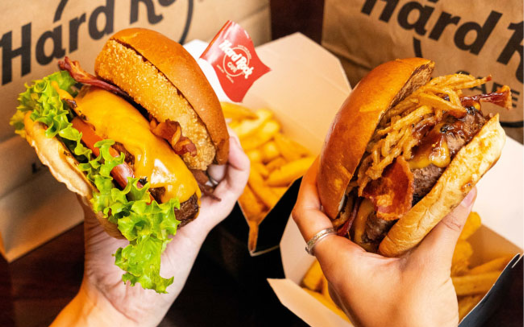 O almoço está previsto para as 12h e inclui um prato principal por pessoa/criança e uma bebida. As opções disponíveis incluem um saboroso Hard Rock Cheeseburguer, uma apetitosa Grilled Chicken Sandwich, uma Grilled Chicken Caesar Salad ou um Veggie Burguer. A bebida pode ser um refrigerante, um café ou um chá.