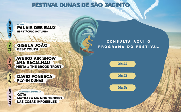 A Câmara Municipal de Aveiro promove, de 22 a 24 de agosto, a nona edição do Festival Dunas de São Jacinto. Com um cartaz musical de referência e um programa abrangente, gratuito e para todas as idades, o evento volta a celebrar o verão num território de elevada riqueza natural, com forte envolvimento comunitário. Este ano, o grande espetáculo noturno será o inédito “Palais des Eaux”, apresentado nas noites de sexta-feira e sábado, com música, luz e projeção em grande escala, reforçando a componente imersiva do evento. No sábado à tarde, regressa também o Aveiro Air Show, que promete impressionar com manobras acrobáticas sobre a Baía de São Jacinto.