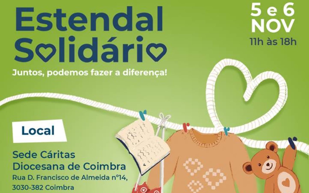 Nos dias 5 e 6 de novembro, das 11h00 às 18h00, a Cáritas de Coimbra, através do seu Centro de Apoio Social (CAS), promove mais uma edição do Estendal Solidário. Trata-se de uma iniciativa já reconhecida pela comunidade, que combina apoio social com práticas sustentáveis. Nesta edição, todos os artigos disponíveis no Estendal Solidário terão como finalidade angariar fundos para a campanha Natal Solidário 2025, um apoio determinante para que muitas famílias da região possam viver uma quadra festiva mais digna e tranquila. Cada peça escolhida representa um contributo direto para quem mais precisa.