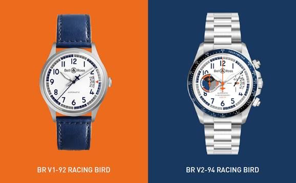 Esta identidade associada a velocidade e desempenho é evidente no design dos relógios Racing Bird, tanto no de três ponteiros como no cronógrafo. Estes relógios partilham as suas opções estéticas com o avião de competição concebido pelo estúdio da Bell & Ross, particularmente o código de cor: o mostrador é branco, como a fuselagem do avião. Os números, o aro, o contador do cronógrafo e o bracelete são azuis, como a empenagem e os elementos decorativos que marcam as linhas aerodinâmicas do BR-Bird. O ponteiro dos segundos central, os pormenores no mostrador e o forro do bracelete em couro são laranja, como a cor que realça as informações mais importantes dos instrumentos de voo. O contador é cinzento, fazendo lembrar a bandeira axadrezada utilizada nas competições de velocidade, como o logótipo Bell & Ross nas asas e flancos do avião.