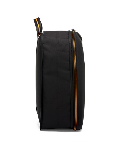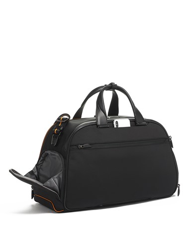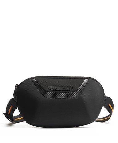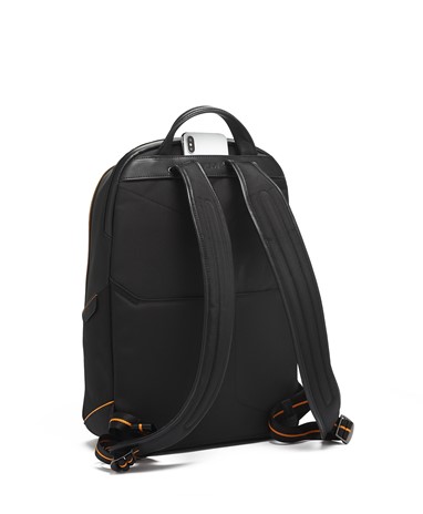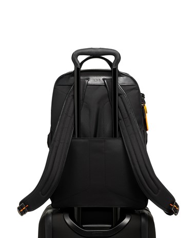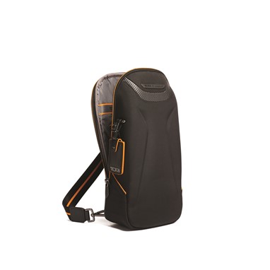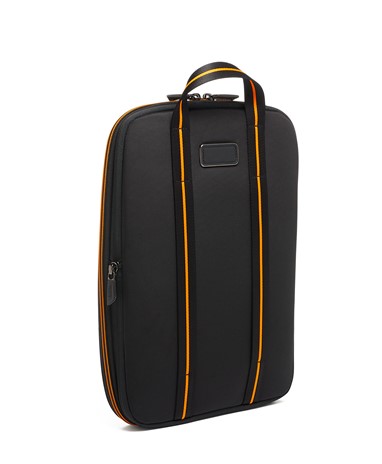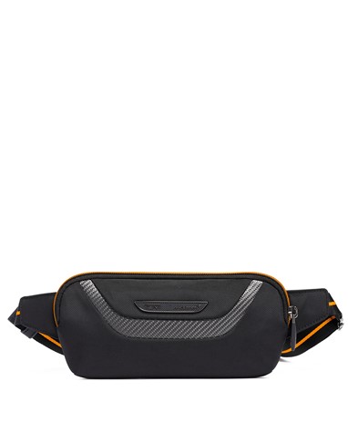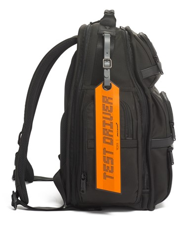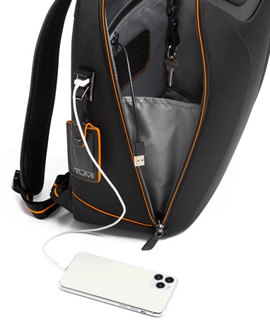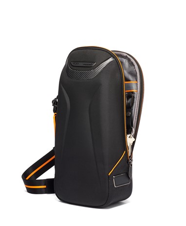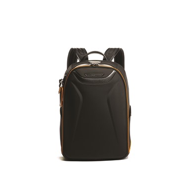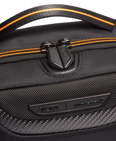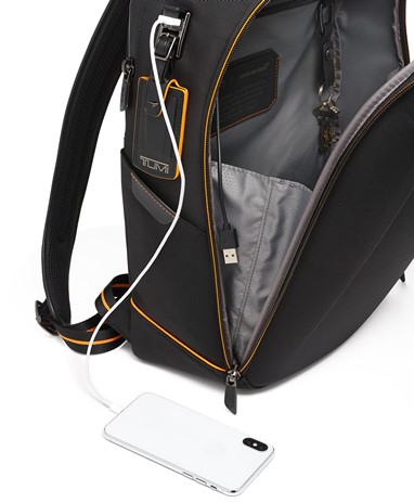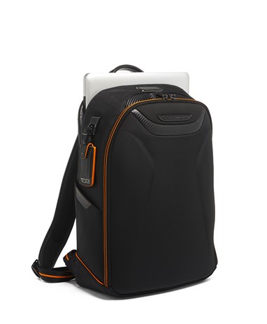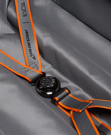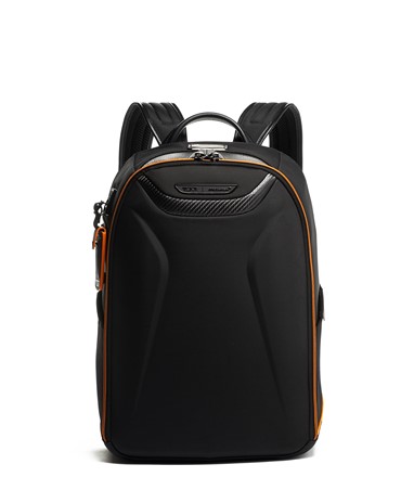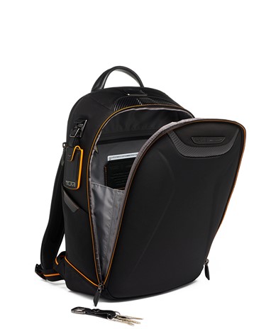 A Halo Backpack incorpora um desempenho de luxo, com um painel frontal moldado, uma manga acolchoada que pode aguentar até um portátil de 14 polegadas e uma porta USB incorporada para recarga on-the-go. É acentuado com fibra de carbono, pormenores da icónica cor papaia, uma pega de pele e subtis fechos magnéticos com a marca TUMI e McLaren.