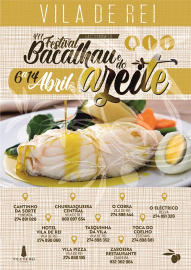Organizado pela Câmara Municipal de Vila de Rei, o 12.º Festival Gastronómico do Bacalhau e do Azeite vai contar com a participação dos seguintes restaurantes: Cantinho da Sorte – Fundada, Churrasqueira Central – Vila de Rei, Hotel Vila de Rei – Vila de Rei, O Cobra – Vila de Rei, O Eléctrico – Relva, Tasquinha da Vila – Vila de Rei, Toca do Coelho – Estevais, Vila Pizza – Vila de Rei e Zaboeira Restaurante - Zaboeira.
