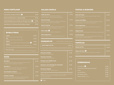 Aqui poderá encontrar uma variedade de ovos, bowls (frias e saladas), panquecas, tapiocas e tostas & burgers. Entre os destaques, não pode perder o Hash Brown (prato típico dos pequeno-almoços Nova Iorquinos) com Maionese de Alho Negro Caseira, a Panqueca Dutch Baby (pela qual terá de esperar 20 minutos, mas que é um dos ex-líbris da casa), a Sandes Deli (com carne laminada e inspirada na famosa sandes do Kat’z Delicatessen) e a Tapioca do Mar. Para os vegetarianos e veganos também existem várias opções como a Tapioca da Terra (vegan), o Veggie Burger (vegetariano) e as Bowls Vegan e Vegetariana.