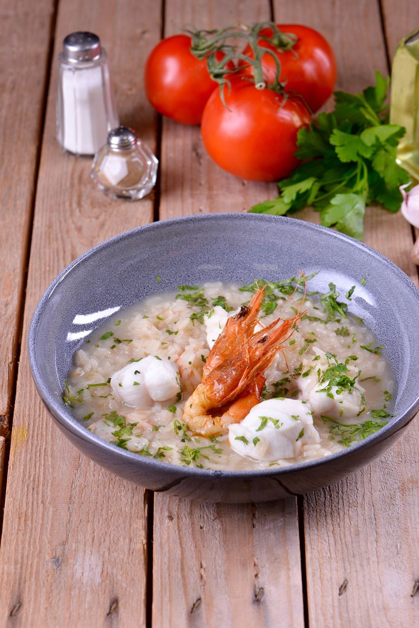 Adicione o arroz, deixe que refogue e, pouco a pouco, adicione o caldo de peixe que preparou anteriormente. Deixe cozinhar durante 15 minutos e quando o arroz estiver quase cozido, adicione o tamboril cortado em pedaços pequenos e os camarões descascados. Tape e deixe cozinhar por mais 5 minutos.