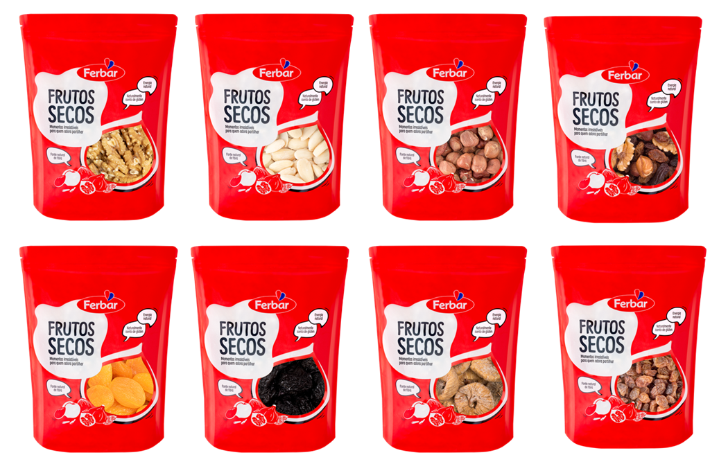 Seja para petiscar como para incluir nas mais diversas receitas, os frutos secos são uma presença assídua nas celebrações de Natal e Passagem de Ano dos portugueses. Nesse sentido, as unidades de frutos secos de 180 grs da Ferbar estão disponíveis em doypacks, de abertura fácil, que permitem uma maior conservação dos frutos secos após a abertura da embalagem devido ao fecho reutilizável. Esta linha inclui uma vasta variedade de frutos secos, ideais para confecionar pratos natalícios e adoçar a mesa de Consoada, tais como, noz, amêndoa com ou sem pele, figo, sultana, avelã, alperce, entre outros. Em saquetas de 100 g é ainda possível encontrar noz pecan, caju cru, fusão frutos secos (que inclui noz, avelã, amêndoa, sultana e uva passa), e fusão natura (composta por noz, avelã, caju e amêndoa sem pele).