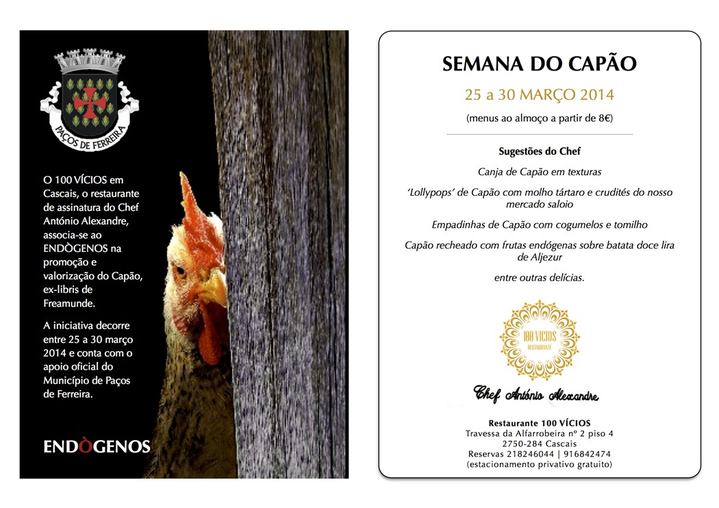 O 100 VÍCIOS em Cascais, restaurante de assinatura do Chef António Alexandre, associa-se ao Projecto ENDÒGENOS na promoção e valorização do Galo Capão, produto ex-libris de Freamunde.