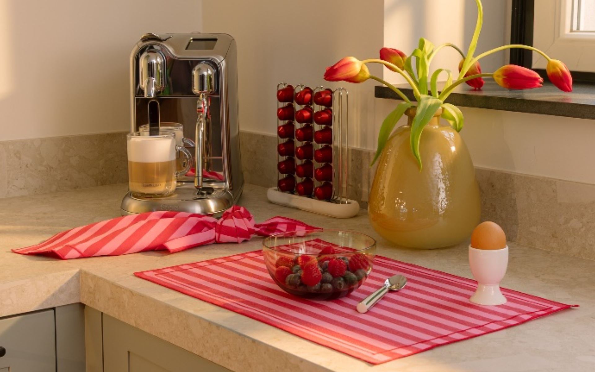 A coleção de edição limitada Nespresso x Torres Novas é composta por conjuntos de dois guardanapos às riscas — nas cores creme e encarnado ou rosa e encarnado— e dois individuais nos mesmos tons. Peças contemporâneas e funcionais, criadas para enriquecer os rituais do dia-a-dia com elegância e propósito.