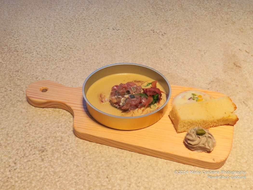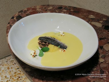 O Menu 6ª edição do Projecto Endògenos, que foi harmonizado com vinhos brancos Quinta da Calçada, arrancou com um Amuse-bouche sardinha marinada, com ovas e uma flute de Portal da Calçada espumante com sumo de alperce