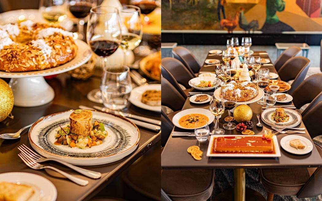 O couvert de pão artesanal de massa mãe, azeite virgem, manteiga de ervas e azeitonas marinadas antecede uma reconfortante Sopa de peixe e mexilhão com aroma de coentros. O tradicional Bacalhau surge em lombo escalfado, sobre puré de grão e couves, seguido do emblemático Cabrito assado com grelos, batata e arroz de miúdos. A doçaria natalícia chega em buffet, num convite à partilha, acompanhada por vinhos da Adega Mãe PHC Hotels, cerveja, refrigerantes, água e café.