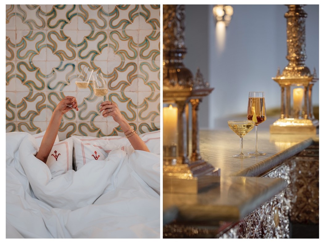 É um dos novos hotéis do Algarve, um sítio que junta a elegância de um antigo palácio recuperado com o charme de uma medina, inspirada na história árabe da região. Um sítio que convida ao descanso e, claro está, na noite de 31 de dezembro, também à diversão, à mesa do restaurante Mirsal. As celebrações de Ano Novo começam com um cocktail acompanhado por um músico a tocar saxofone e prosseguem com um jantar de degustação com harmonização vínica. De entradas haverá Tártaro de novilho e ostra, Tempura de Bacalhau e Pão de massa-mãe; para os primeiros momentos, o chef Fábio Domingues vai preparar Lagosta com pastinaca e caviar e Rodovalho com couve-flor e champanhe; para o segundo momento ficam reservados um Ravioli de trufa com cogumelos selvagens e café e ainda um Lombo de novilho com foie gras e salsifis; e à sobremesa, Chocolate, sacher e laranja, a combinar com Kopke reserva Tawny. O valor é de 197 €, por pessoa, valor que inclui também uma surpreendente continuidade da experiência: à meia-noite, os clientes são convidados a pegar numa pequena garrafa de espumante e caminhar três minutos até à histórica Ponte Antiga de Tavira para assistir ao fogo de artifício e começar o ano de forma memorável.