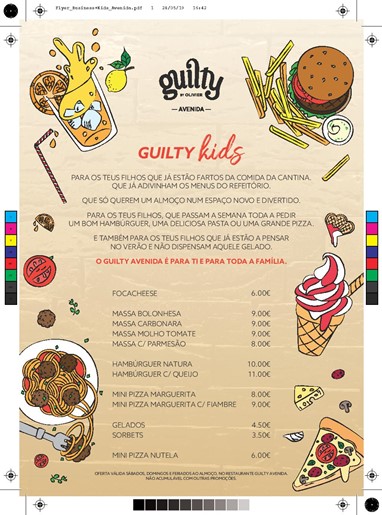O menu Guilty Kids está disponível sábados, domingos e feriados, ao almoço, nos três restaurantes da marca: na Avenida da Liberdade, no Parque das Nações (Piso Térreo do Tivoli Oriente) e no Porto na zona da Boavista.