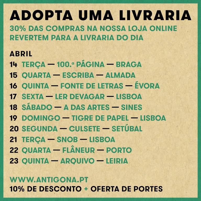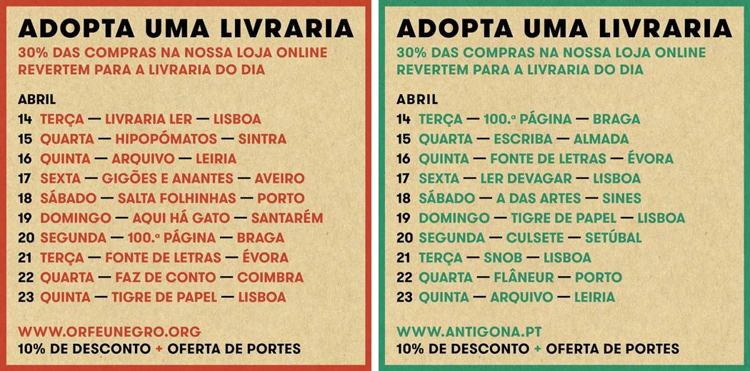 De 14 a 23 de Abril (Dia Mundial do Livro), os leitores que encomendarem livros nos sites da Orfeu Negro ou da Antígona estarão a apoiar directamente a livraria designada para esse dia: 30% do valor líquido das suas compras reverte para a livraria. Além disso, terão 10% de desconto sobre o PVP de cada livro e portes gratuitos.