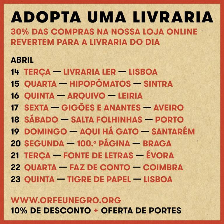 A lista completa das livrarias e dos dias da campanha pode ser consultada nas imagens mais abaixo e nos sites das editoras (www.orfeunegro.org e www.antigona.pt) a partir de segunda-feira, dia 13 de Abril.