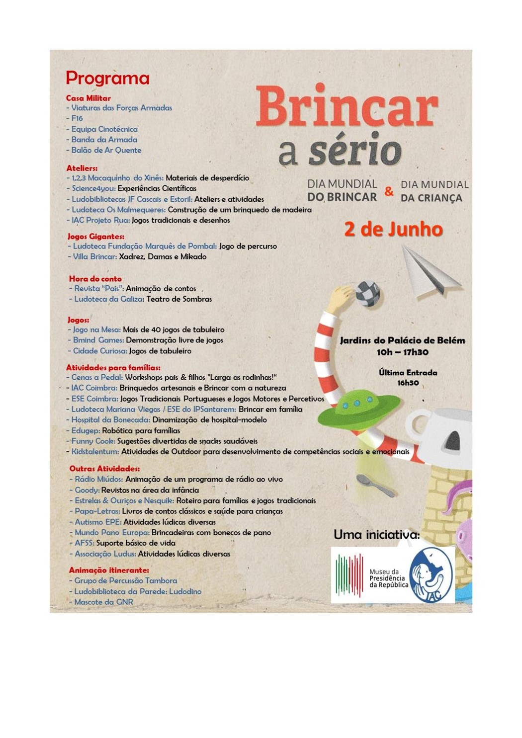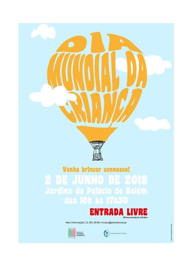 Os Jardins do Palácio de Belém acolhem no dia 2 de junho um programa especial para comemorar o Dia Mundial da Criança e o Dia Mundial do Brincar, numa associação entre o Museu da Presidência da República, a Casa Militar da Presidência da República e o Instituto de Apoio à Criança.