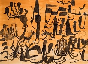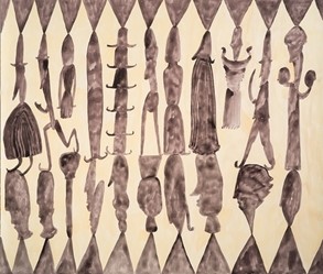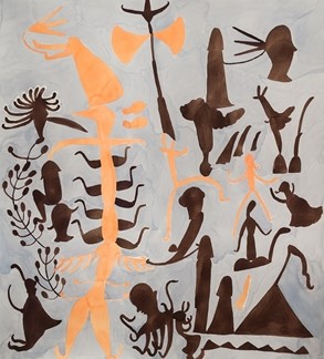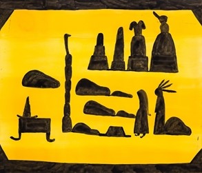 Séries narrativas, desenhos coloridos com figuração de influência aborígene.
