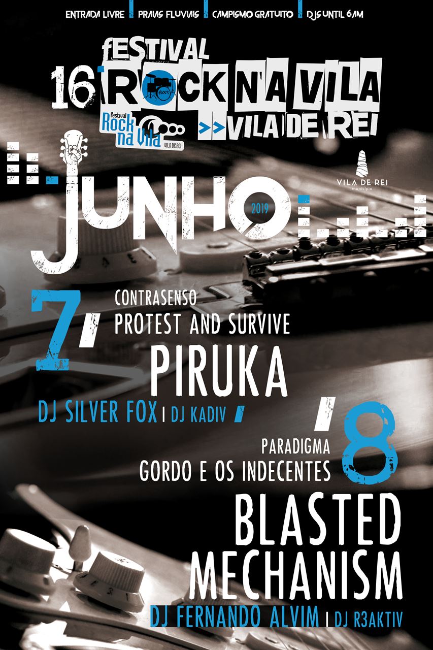 Organizada pelo Município de Vila de Rei, a décima sexta edição do Festival apresenta como principais atrações o rapper Piruka e a banda Blasted Mechanism, entre outras excelentes bandas que apresentarão espetáculos de grande qualidade aos milhares de festivaleiros esperados em mais um Rock na Vila.