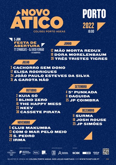 É neste contexto de recuperar a vida cultural do Porto, as matinés de domingo, que o NOVO ÁTICO apresenta a sua programação. Até ao final do ano estão já confirmados Josh Rouse, 5.ª Punkada, Club Makumba, Blind Zero, JP Simões, João Paulo Esteves da Silva, Cassete Pirata, NEEV, Kuia Só, Elisa Rodrigues, Irma, Cachorro Sem Sono, A Garota Não, Daguida, JP Coimbra, The Happy Mess, S. Pedro, Com o Mar Pelo Meio e Surma.