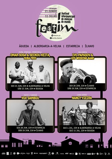 Omar Sosa & Seckou Keita, Suba Trio (Cuba, Senegal, Venezuela), Ivo Papasov & His Wedding Band (Bulgária), Vox Sambou (Haiti / Canadá) e Nancy Vieira (Cabo Verde) são as estrelas que compõem o cartaz do 15º Festim, Festival intermunicipal de músicas do mundo, que decorre de 21 de junho a 11 de julho, em Águeda, Albergaria-a-Velha, Estarreja e Ílhavo.