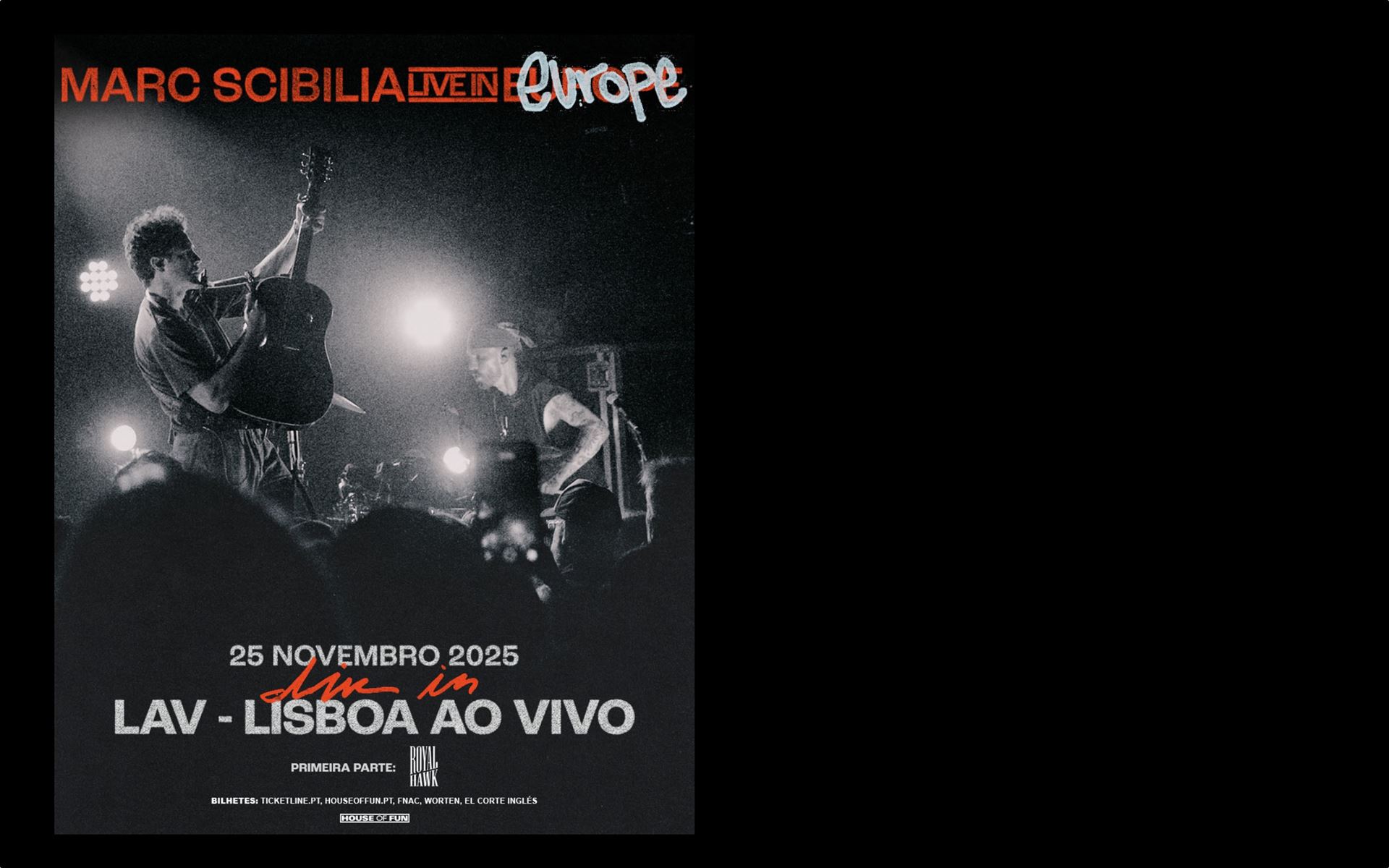 ROYAL HAWK foi criado pelo songwriter e produtor Nolan Sipe, que tem tido muitos êxitos mundiais com artistas como Benson Boone, One Republic, Andy Grammer, Jonas Brothers, entre outros. Agora, Nolan Sipe está a sair dos bastidores e a assumir-se enquanto artista a solo e, como ROYAL HAWK, acompanhará o também cantor, compositor e songwriter MARC SCIBILIA nesta digressão europeia e pelo Reino Unido, que passa por Portugal a 25 de novembro, no LAV- Lisboa Ao Vivo. Os bilhetes estão disponíveis em ticketline.pt e locais habituais.