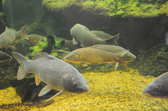 Após a reprodução com sucesso de várias carpas de 20kg. Desde Agosto que se avista agora juvenis desta espécie - Cyprinus carpio e, neste momento, os exemplares tem 15cm de comprimento mantem-se unidos entre a vegetação do aquário para a sua sobrevivência.