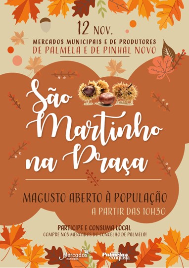 Os Mercados Municipais e de Produtores de Palmela e de Pinhal Novo comemoram o São Martinho com o tradicional “São Martinho na Praça”. No dia 12 de novembro, há magusto aberto à população a partir das 10h30.