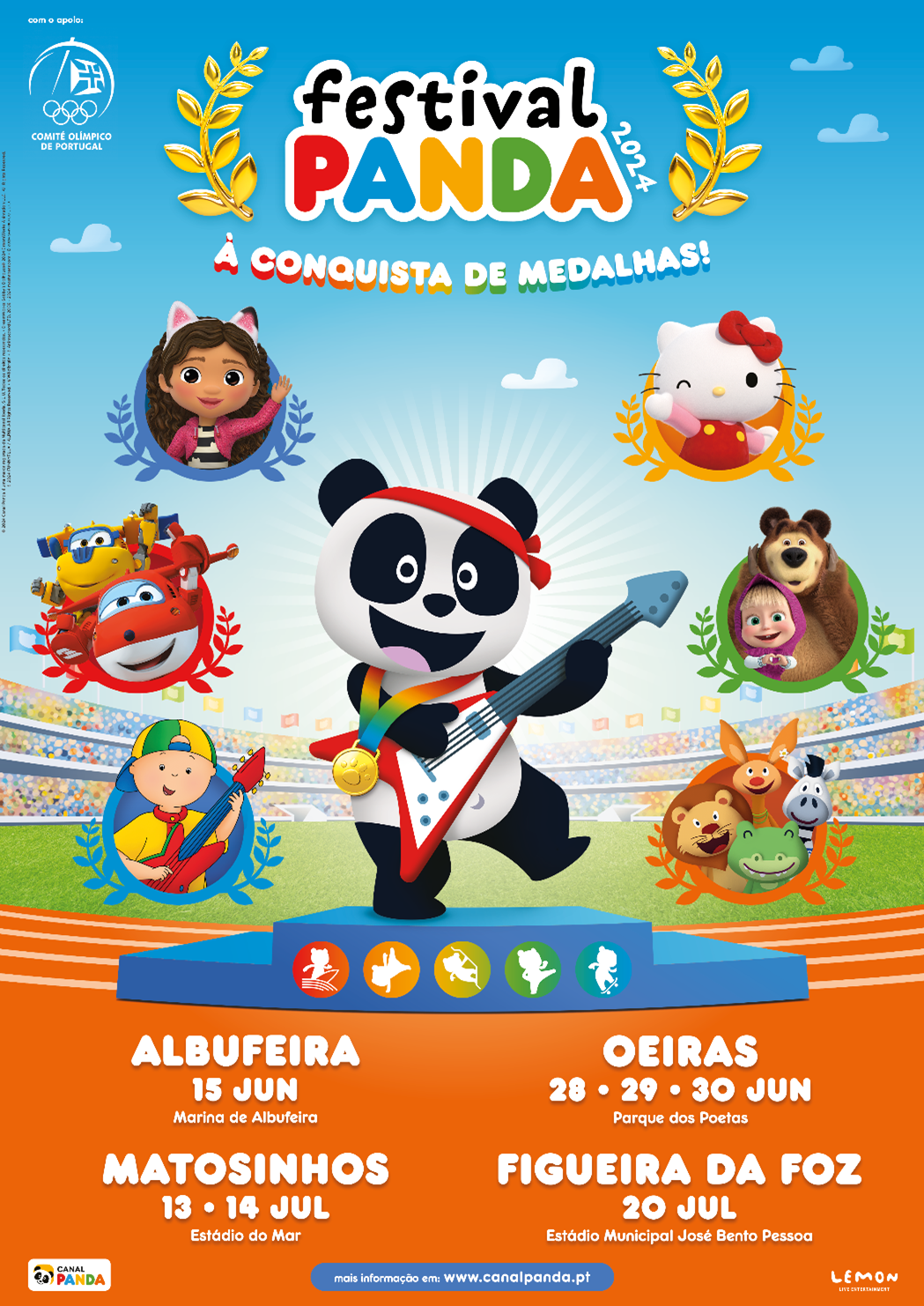 “A Casa de Bonecas da Gabby”, “Hello Kitty”, “Super Wings” “Ruca” e “Masha&Urso” são os personagens de peso confirmados na 17ª edição do Festival Panda, o maior evento infantil em Portugal que este ano está dedicado ao tema “À Conquista das Medalhas” e que promete uma festa repleta de diversão e espírito olímpico em Albufeira, Oeiras, Matosinhos e Figueira da Foz, a partir de dia 15 de junho.