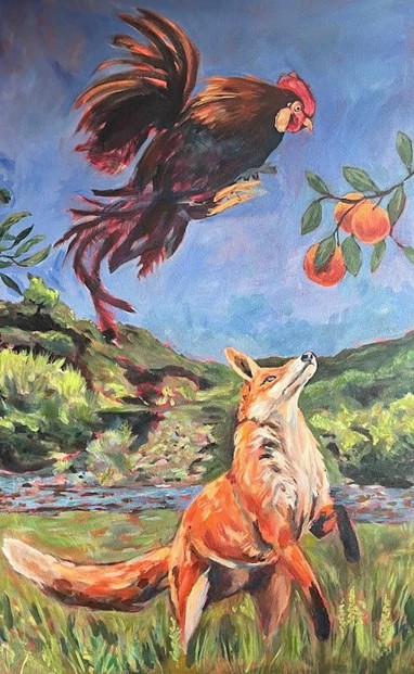 Ao som do Fado, que ouve enquanto pinta, a artista usa narrativas e imagens de mulheres na história da arte e na literatura como referências para pintar as suas próprias experiências como mulher. “Daphne and the Laurel Tree”, uma das pinturas expostas, é inspirada na antiga história Grega de Daphne, que se transforma numa árvore para se esconder de Apolo, e obras como “The Cockerel and the Fox”, “Portrait of my Room” e “Saudade” exploram sentimentos de saudade e dissonância cultural.