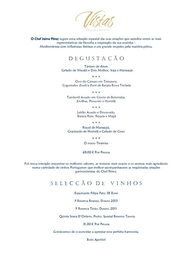 Menu Degustação Clique aqui para ver mais sobre: Vistas - Ementa Eventos Evento Feira de Natal na Casa do Artista - 22 de Novembro a 8 de Dezembro Evento Gastronomia de Bordo: sabores do mar regressam de 28 de novembro a 8 de dezembro Evento As personagens favoritas dos mais pequenos trazem um Natal ao Vivo - Dia 7 Dezembro no Porto e dia 14 em Lisboa Evento O Natal mais mágico da cidade está no Jardim Zoológico - Duendes, animais, ateliers e chocolate quente Cultura: Arquitectura e Design Pintura e Escultura Fotografia Cinema Teatro Dança Música Literatura Exposições Concerto de Natal no Teatro Municipal Joaquim Benite em Almada - Dias 18 e 20 de Dezembro Evento MUSICAL-MENTE regressa ao Teatro Nacional São João com ciclo dedicado ao humor na música - Ciclo inicia a 18 de Dezembro Vocalista de Wilco traz o seu espectáculo a solo ao Capitólio - No dia 7 de Fevereiro Teatro Nacional D. Maria II regressa ao Rossio em junho de 2026 com programa Prólogo - Reabertura oficial em setembro Solta-te: Restaurantes Bares e Discotecas Tascas Vinhos e Gourmet Gastronomia Nat’elier lança novos sabores de pastel de nata pensados para os dias mais frios 26 Vegan Food Project apresenta menu de Natal Vegan para levar para casa Quintas de Melgaço sugere quatro cabazes para este Natal - Vinhos de assinatura, compotas e queijos que são uma ode à origem Santini apresenta novidades de Natal - Mini bolos de gelado à escolha e bombons de chocolate artesanais recheados com gelado Viagens Hóteis Turismo Rural Destinos Evento Sintra ilumina-se: Palácio da Pena apresenta percurso inédito com iluminação de Natal - Ao longo do mês de Dezembro com serviço de autocarros entre a vila de Sintra e o Parque da Pena Evento Plutonio e reggaeton fazem a festa de Fim d’Ano em Lisboa Palacete do Guerreiro celebra o Natal e o Ano Novo com sabores locais, luxo e tranquilidade na Serra da Estrela João Santos Tavares assume a presidência da Associação Portuguesa para a Diversidade e Inclusão - Mandato 2025–2027 Outdoor Evento Festival Panda anuncia estrelas confirmadas na 17ª edição - Entre Junho e Julho pelo país Evento Arte no Jardim: Monet & Klimt em Guimarães prolongada até ao final de Setembro - Experiência luminosa no jardim do Museu de Alberto Sampaio Evento Festa do Tomate Coração de Boi do Douro - Nos restaurantes da região Agosto é o mês do Tomate Cinco dicas para se refrescar em casa nos dias de calor - Diminuir o desconforto Fashion Neste natal COUTO oferece um presente por dia - Marca fará um calendário do advento nas lojas física e online Evento Tradição, tendência e talento em exposição na Portojóia de 25 a 28 de setembro - (IM)PACTO da joalharia portuguesa na Exponor para a 34.ª edição do certame Evento Festival Sephora Summer Vibes chega a Lisboa - Celebrar o verão com música, beleza e experiências inesquecíveis The Royal Collection: celebrar a história da joalharia real portuguesa - Uma iniciativa do Museu Tesouro Real e da Leitão & Irmão Kids Evento O mundo mágico de Jack - Teatro Armando Cortez até 24 de Março Escola do porto traz magia à noite do Mar Shopping Matosinhos - No sábado, 29 de abril, às 21h00 “Dominguinhos” Um ecossistema sustentável para levares contigo aonde fores - Atelier de Educação Ambiental nos “Dominguinhos” de 23 de abril Evento Festival Panda 2023 arranca em Oeiras