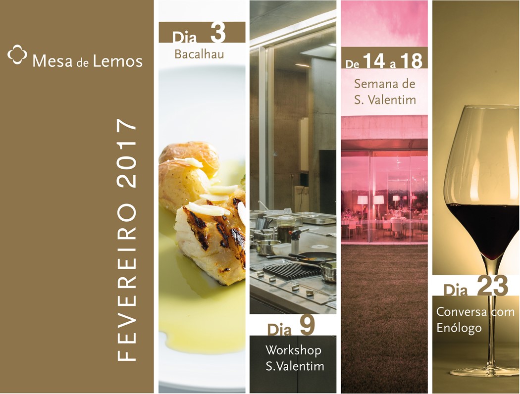 No dia 9 de Fevereiro, às 19h30, terá lugar no restaurante Mesa de Lemos um workshop de culinária relativo ao Dia dos Namorados (55€ por pessoa), realizado pelo chef Diogo Rocha.
