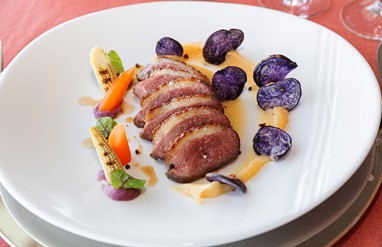 A carta é composta por pratos leves e estivais que vão de uma salada fresca de lavagante e abacate com redução de citrinos do Algarve a um ceviche de robalo e salmão com geleia de toranja rosa. Nos peixes os destaques vão para o dueto de pregado frito em panko, lula recheada com quinoa e ervilhas de quebrar ou robalo de mar com puré de couve-flor e açafrão, pak choi e molho de ramisco. No que respeita às carnes há, por exemplo, magret de pato com puré de pastinaca e chili, cebola roxa e batata violeta com molho de zimbro e mel..