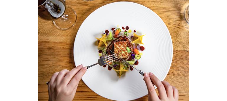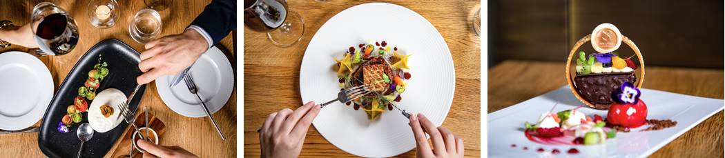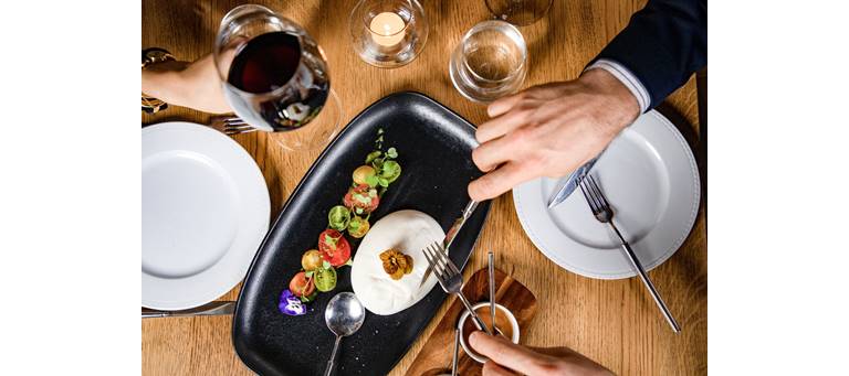 A viagem gastronómica inicia-se com Burrata di Ândria e trufa preta, stick presunto novilho e chutney de figos, sambal de manga e pato fumado, - um prato exclusivo do espaço - e Carpaccio de robalo e salada de crustáceos e bivalves, marinada de bergamota.