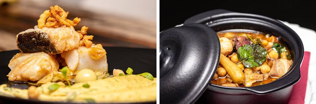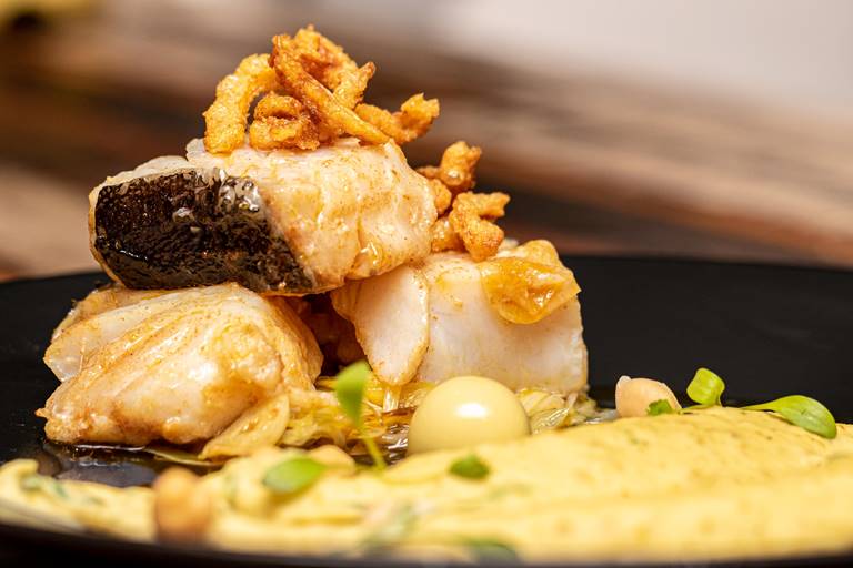 Nos peixes, o Chef sugere um reconfortante Bacalhau Confitado com Puré de Grão, Alho Francês Estufado, Samos Fritos e Bomba de Azeitona; Cachaço de Bacalhau, Creme e Açorda de Sapateira, Trouxa de Abobora, Broa e Amêndoa; Filetes de Peixe Galo com Percebes e Açorda de Ovas ou Robalo com Pasta de Azeitona de Portalegre, Arroz Negro e Molho de Laranja.