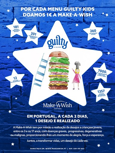 Na compra de um menu Guilty Kids, um euro reverte para a realização de desejos de crianças e jovens gravemente doentes. É esta a receita dos restaurantes Guilty by Olivier para ajudar a Fundação Make-A-Wish Portugal, que concretiza atualmente um desejo a cada dois dias.