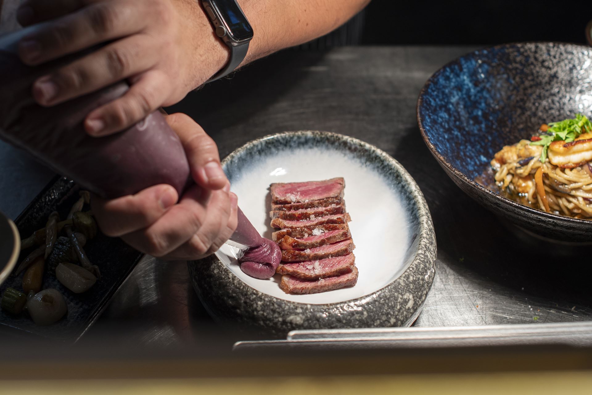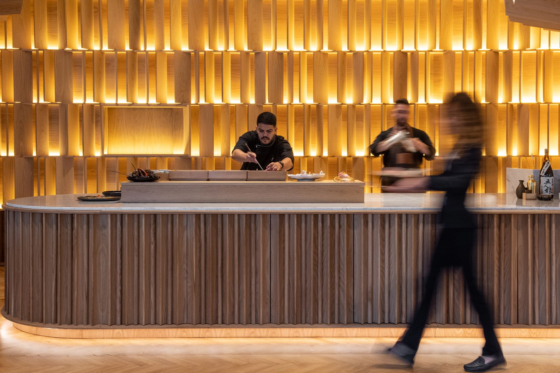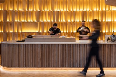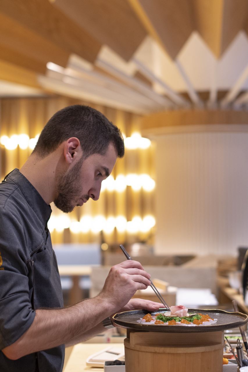 A arquitetura e decoração transportam-nos para o Japão contemporâneo, com uma estética que privilegia as madeiras naturais, a iluminação suave e o detalhe. A cozinha aberta, situada atrás do bar, estabelece uma ligação direta com a sala e recria a dinâmica íntima das izakayas tradicionais, onde o ritual da preparação faz parte da experiência sensorial.