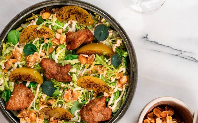 O universo colorido das saladas é marcado por combinações leves, frescas e equilibradas, como melancia, feta e manjericão (14€), frango, pêssego e amendoim (16€) ou a salada caeser (16€), que quebra paradigmas e substitui o frango pelas gambas.