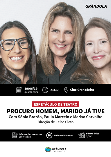 Marisa Carvalho, Paula Marcelo e Sónia Brazão sobem ao palco do Cine Granadeiro Auditório Municipal em Grândola, no próximo dia 19 de Junho às 21h30, com a peça encenado por Celso Cleto “Procuro Homem, Marido já Tive”.