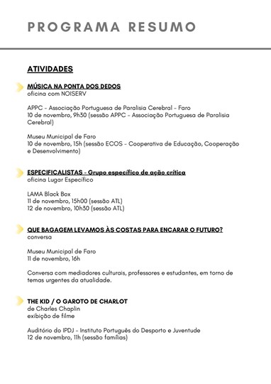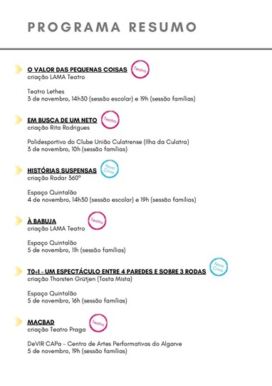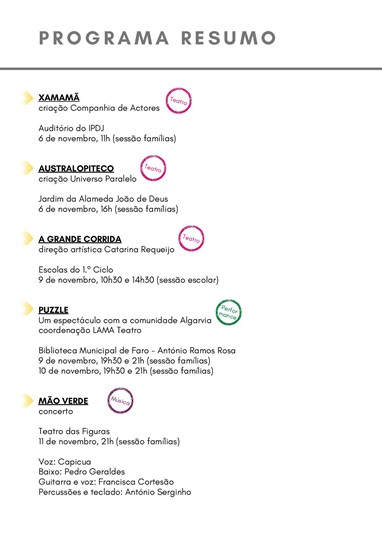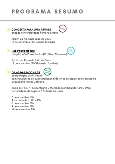 A 9 de novembro, a personagem Manuela arranca com A Grande corrida, numa criação de Catarina Requeijo. Também neste dia, e até 10 de novembro, João de Brito (LAMA Teatro) coordena PUZZLE, um espetáculo criado com a Comunidade Algarvia e que se apresenta na Biblioteca Municipal de Faro.