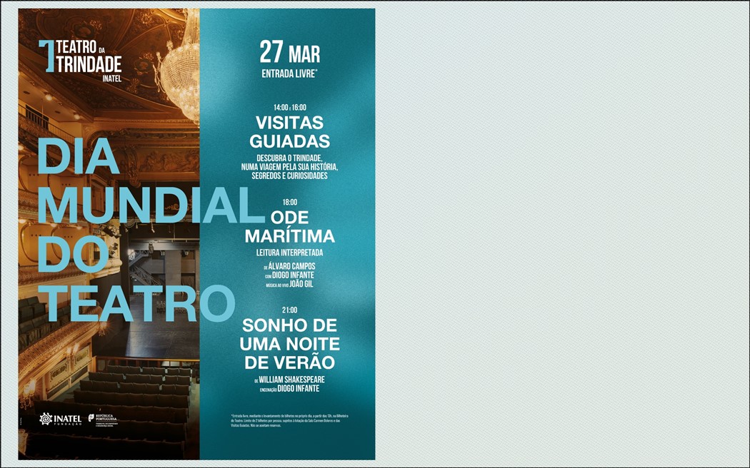 No dia 27 de março, o Teatro da Trindade INATEL celebra o teatro de uma forma especial. A leitura interpretada de “Ode Marítima” por Diogo Infante, acompanhada ao vivo pelo músico João Gil, e visitas guiadas aos bastidores do edifício são duas das propostas de entrada livre neste Dia Mundial do Teatro. Será ainda disponibilizada para oferta uma quota de bilhetes para o musical “Sonho de Uma Noite de Verão”.