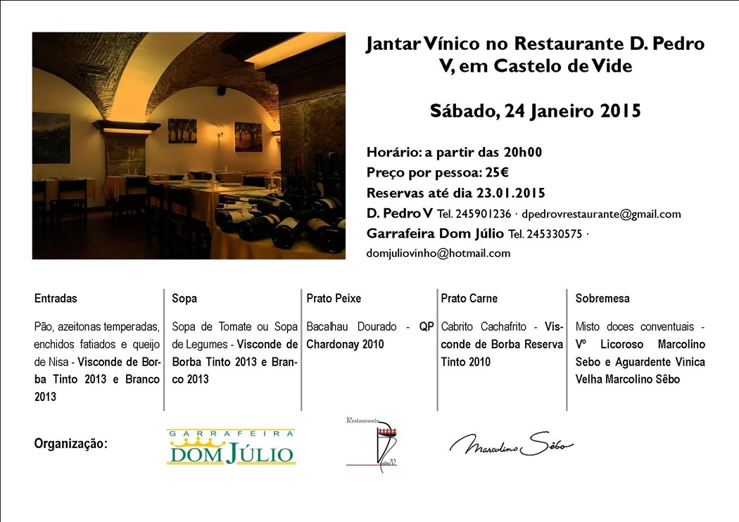 Este jantar vínico tem um custo de 25€ por pessoa, com os vinhos incluídos. As inscrições são limitadas. Para mais informações e reservas Restaurante D. Pedro V – 245901236 ou Garrafeira Dom Júlio – 245330575.