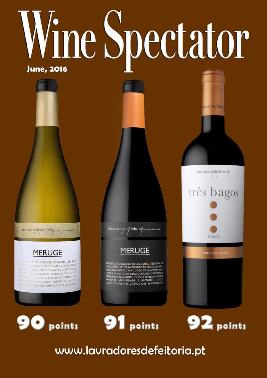 O especialista em vinhos, provador, e editor executivo Kim Marcus atribuiu, respectivamente, ao ‘Meruge branco 2014’, ao ‘Meruge tinto 2013’ e ao ‘Três Bagos Grande Escolha tinto 2011’, 90, 91 e 92 pontos.