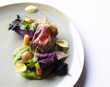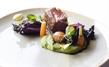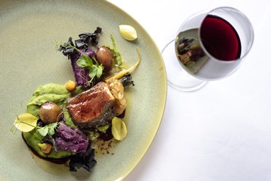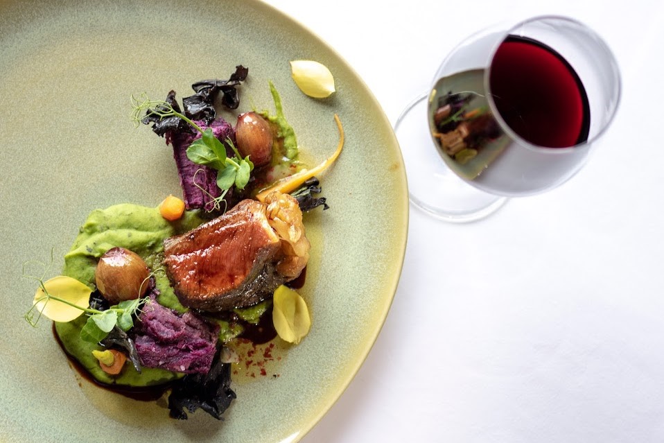 Segue-se o prato principal, que se apresenta com um dos ícones da casa, o Taylor’s Late Bottled Vintage 2014. O vinho acompanha um Vitelão com batata doce roxa, lapela de pimenta rosa, cebolinhas em vinho do Porto, cenouras baby sobre ervilha trufada e cogumelos trompetas da morte.
