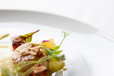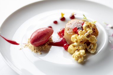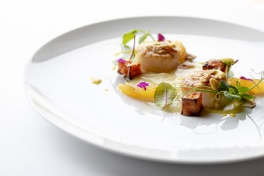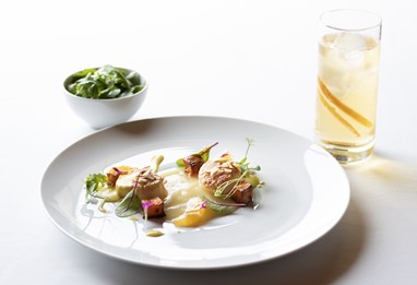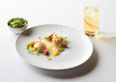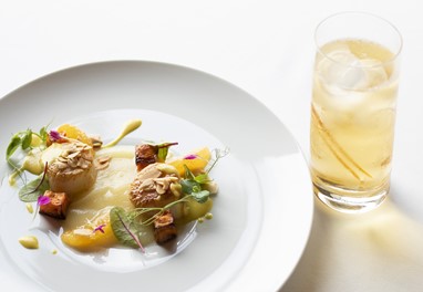 A experiência inicia-se com um refrescante Taylor’s Chip Dry White Port Tonic, que prepara o palato para a refeição. A acompanhar, serve-se a entrada de Vieiras sobre pera-rocha cremosa, abóbora assada, laranja, mini acelga, amêndoa do Douro tostada e molho de caril.