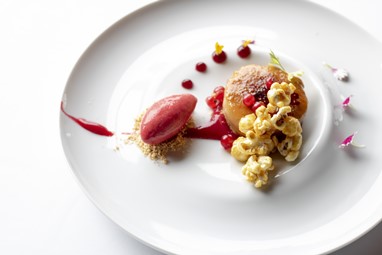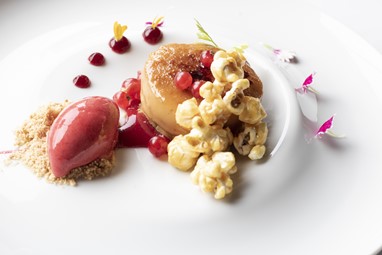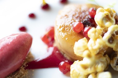 Perto do final, a sobremesa chega à mesa com Taylor’s 10 Year Old Tawny Port, servido com um Crème brûlée de caramelo sobre crumble de frutos secos, pipocas caramelizadas, groselhas e gelado de framboesa.